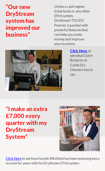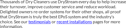 Instantly stand out among your competitors. Enjoy the rewards of subsequent customer loyalty and an increase in profits. With over 20 years experience designing and building EPoS systems exclusively for the UK dry cleaning and laundry industry, DryStream is the only company that can give you this.